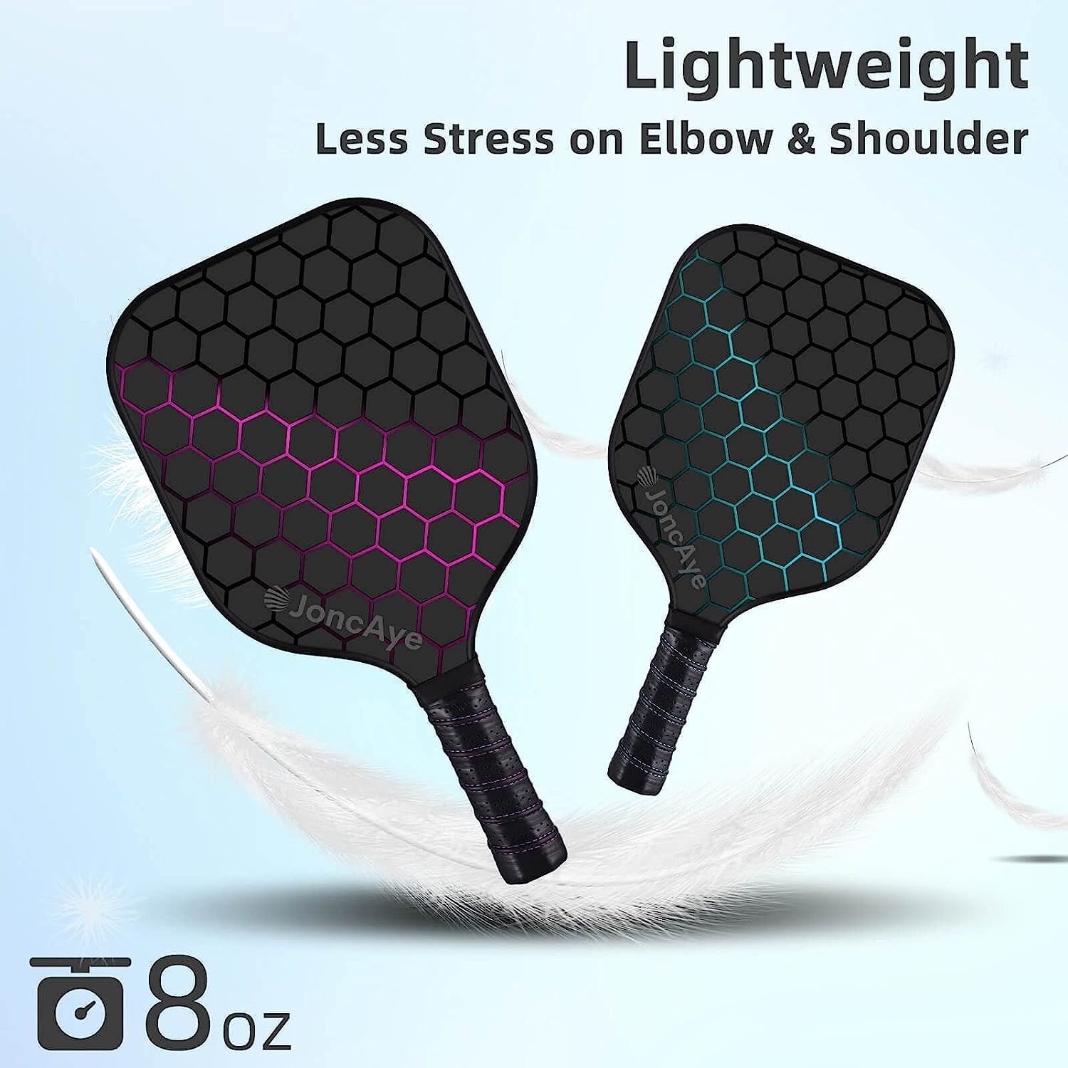 | JoncAye Pickleball Paddle Full Set – Set of 4– the ultimate package for pickleball enthusiasts! This unbeatable value set includes everything you need to enjoy this exciting game with family and friends. Our set comprises four lightweight pickleball paddles made from top-grade fiberglass, offering exceptional strength and stiffness. Each paddle weighs a perfectly balanced 8 oz, ensuring a harmonious blend of power and control. Ideal for players of all levels, especially beginners and intermediates, these paddles allow for extended play without straining your shoulder or waist. Compliant with USAPA standards, our pickleball equipment boasts a generous 8 1/8-inch paddle with a substantial sweet spot, reducing mishits for improved performance. With dimensions of 15 1/2″ L x 8 1/8' W x 1/2'H, including a protective soft edge guard, your pickleball paddles are built to last. But that’s not all! Our Complete Pickleball Set also includes two outdoor and two indoor pickleball balls, four replacement pickleball overgrips, and a convenient pickleball bag to carry it all. Just set up a pickleball net and find a court, and you’re ready to enjoy this amazing game with friends and family. Product Details: COMPLETE PICKLEBALL SET: This pickleball set of unbeatable value includes 4 lightweight pickleball paddles, 2 outdoor pickleball balls + 2 indoor pickleball balls, 4 pickleball overgrips for replacement, and 1 pickleball bag to accommodate the pickleball rackets set of 4 together with all your essential pickleball accessories. Fetch a pickleball net, and find a pickleball court, you can enjoy the amazing game with your family and friends right away! LIGHTWEIGHT PICKLEBALL PADDLE: JoncAye pickleball paddles 4 pack are made of top-grade fiberglass with excellent strength and stiffness. Each pickleball paddle weighs an optimal 8 oz, a great balance of power and control. The premium pickleball racquet suits players of all levels, especially friendly to beginners and intermediates, who can swing the paddle for long time with much less stress on the shoulder and the waist USAPA STANDARD SIZE WITH LARGE SWEET SPOT: JoncAye pickle ball equipment is made in strict accordance with USAPA standards. This pickle ball raquette set of 4 has a wide paddle of 8 1/8 inches with a large sweet spot that will help you to reduce mishits. The dimensions of the pickleball racket are 15 1/2″ L x 8 1/8' W x 1/2'H including the soft edge guard that protects the advanced pickleball paddle from tear & wear CUSHION HAND GRIP WITH EXTRA GRIP TAPES: JoncAye pickleball paddles features a perforated, stitched cushioned grip that is anti-slip and sweat-wicking. It provides you great comfort while enabling precise grip and maneuverability. The 4.25' grip hold suits most hands comfortably. 4 colorful pickleball grip tapes are additionally included for replacement over the time QUIETER PICKLEBALL PADDLE: The composite PP honeycomb core inside this pickleball paddle set of 4 helps the pickleball equipment make less noise than a Nomex core. Now you can enjoy this popular outdoor family game more to your heart’s content with no more worries about disturbing your neighbors |